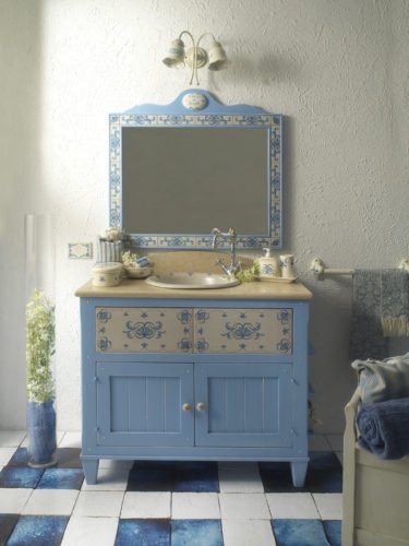 Mobile da bagno con inserti in ceramica decorati a mano come nella tipica tradizione Umbra. Un prodotto nato dalla collaborazione delle migliori artigianalità locali