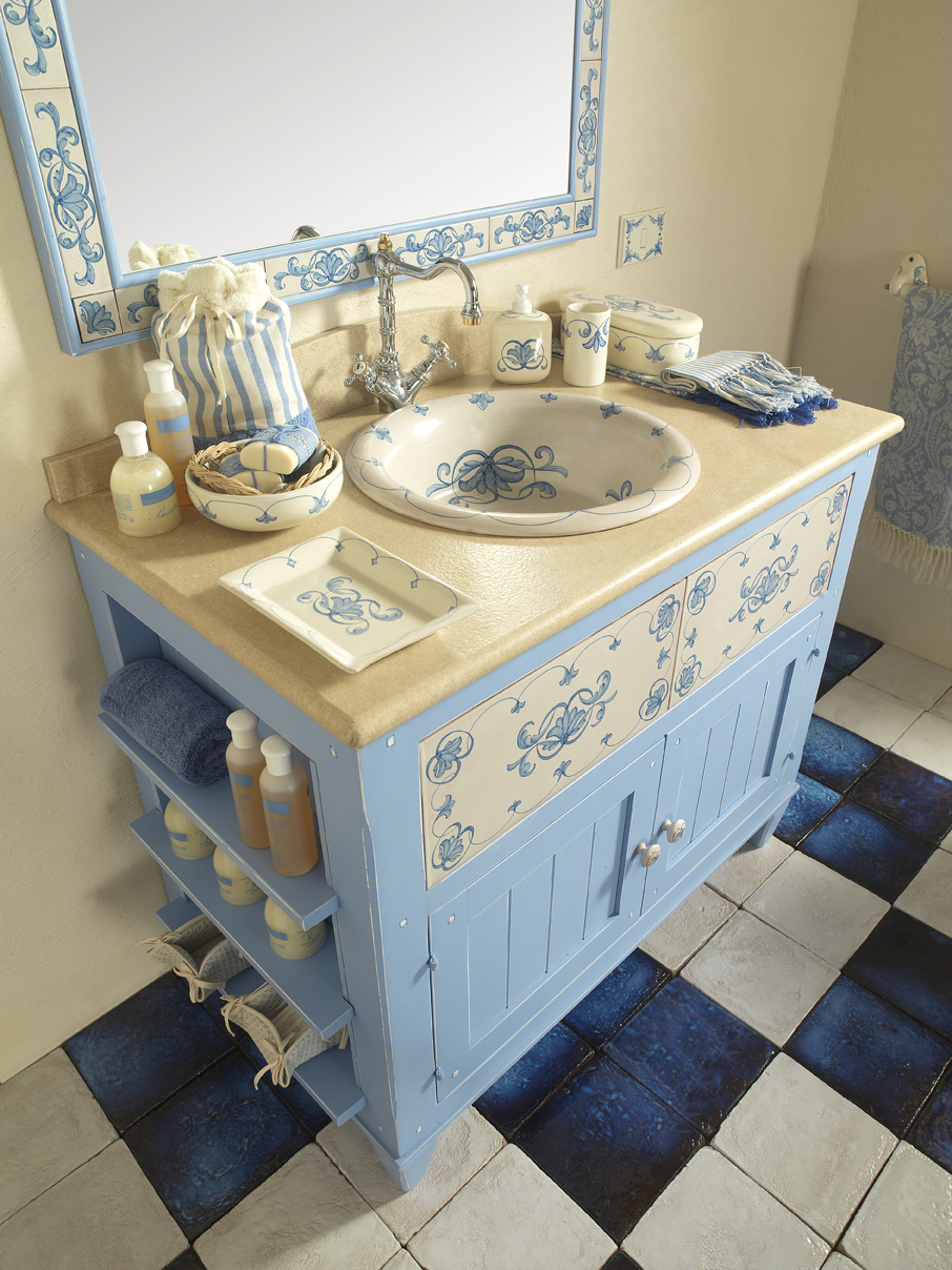 Mobile da bagno con inserti in ceramica decorati a mano come nella tipica tradizione Umbra. Un prodotto nato dalla collaborazione delle migliori artigianalità locali